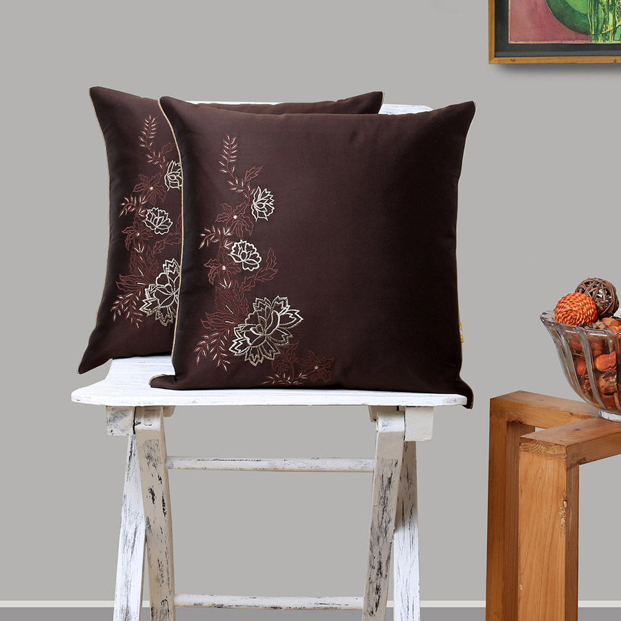 Brown 16"x16" cushion with tonal asymetrical embroidery